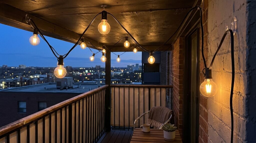 What it is: Outdoor-rated Edison-style string lights hung along your railing, overhead, or zigzagged across the balcony. They are, without question, the single highest-impact thing you can add to a small outdoor space.