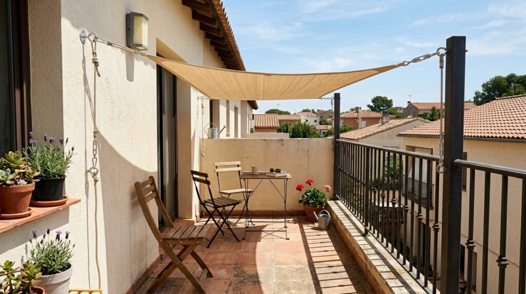 What it is: A fabric canopy — either a retractable awning, a fixed mounted canopy, or a freestanding triangle sail — that creates shade overhead on a sunny balcony.