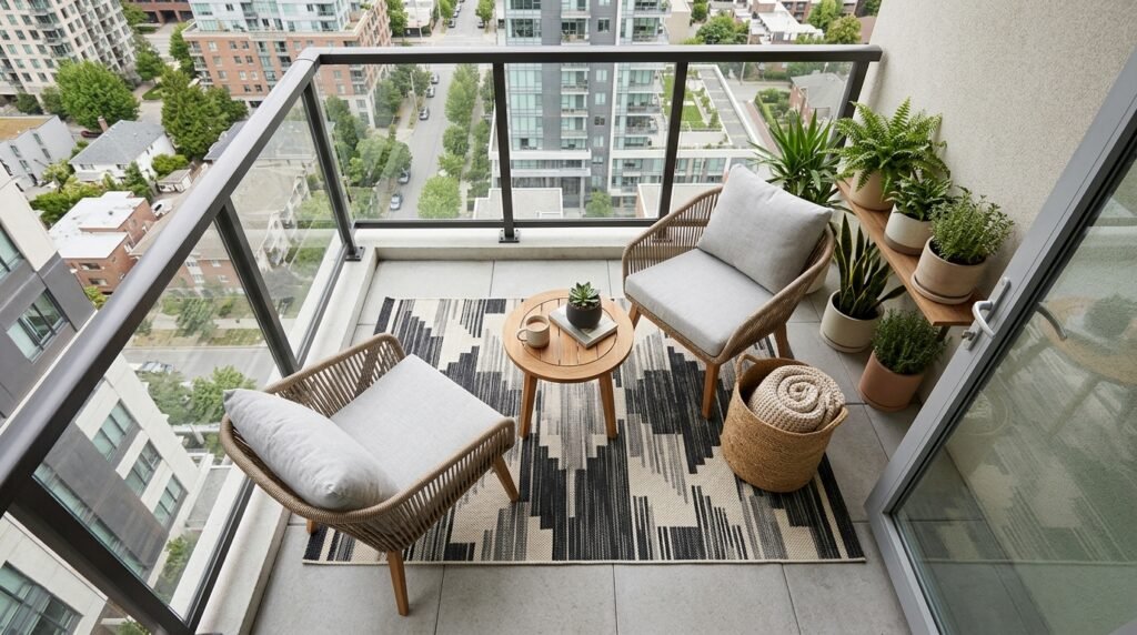 Why it works: Nothing makes a balcony look more like a room than a rug. It visually defines the seating area, softens the concrete or tile underfoot, and adds color and texture where there was only grey.