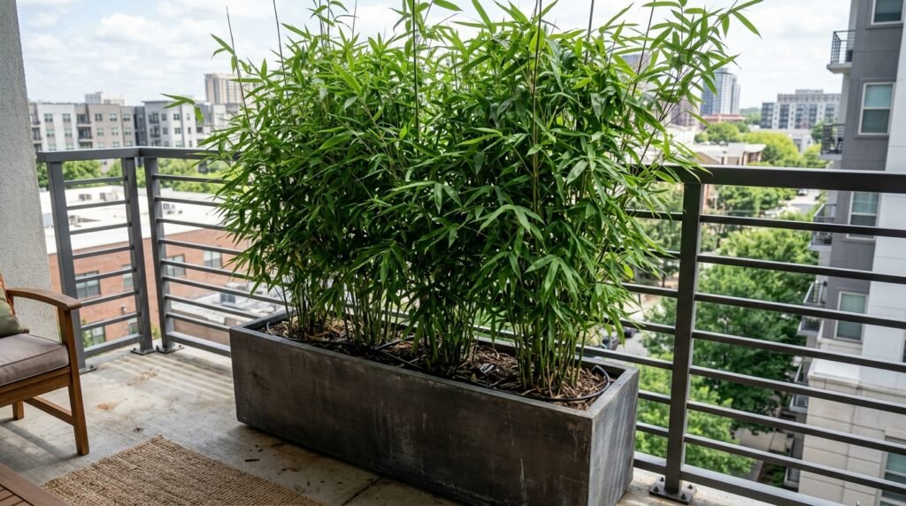 What it is: Deep floor planters — 18 to 36 inches tall — filled with upright, dense plants that create a natural green privacy screen along one side of the balcony.