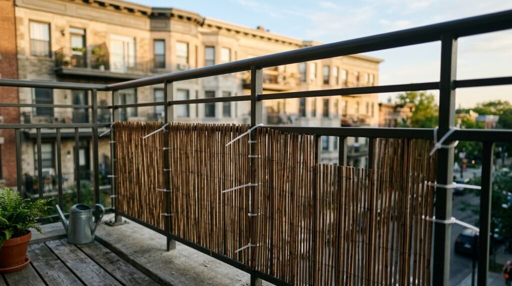 How to get it: Bamboo reed fencing rolls are the most budget-friendly — tie them to the railing with zip ties or wire. Wood slat panels look more polished and can be mounted in a frame for easy removal. Metal laser-cut privacy panels add a modern touch. For renters, avoid any permanent installation — secure to the railing only.