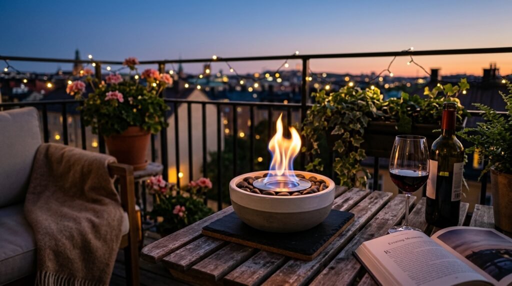 What it is: A compact fire feature — tabletop gel fuel burner, bioethanol tabletop fireplace, or a small propane fire bowl — designed for balcony use.