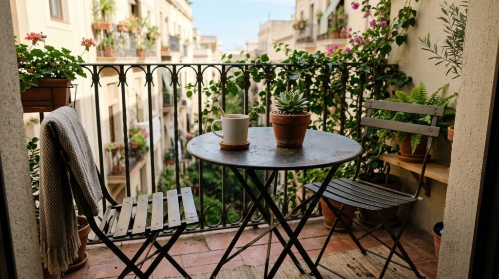 What it is: A small round table — usually 24 to 28 inches in diameter — paired with two lightweight metal or rattan chairs. It’s the classic European café setup, and it fits almost every small balcony.