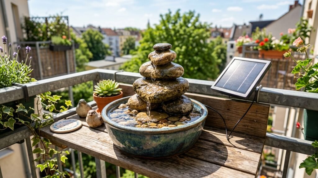 What it is: A small recirculating fountain — powered by a solar panel or a low-voltage plug — that creates the sound of moving water on your balcony.