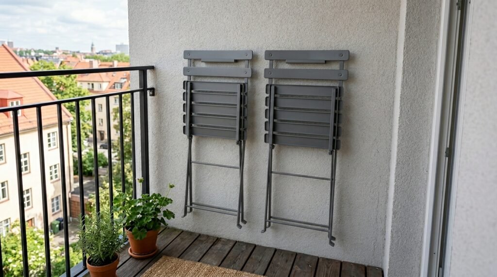 Pro tip: Get a wall-mounted hook or a thin over-the-railing hook to hang folded chairs vertically — that’s the most efficient storage method for a small balcony.