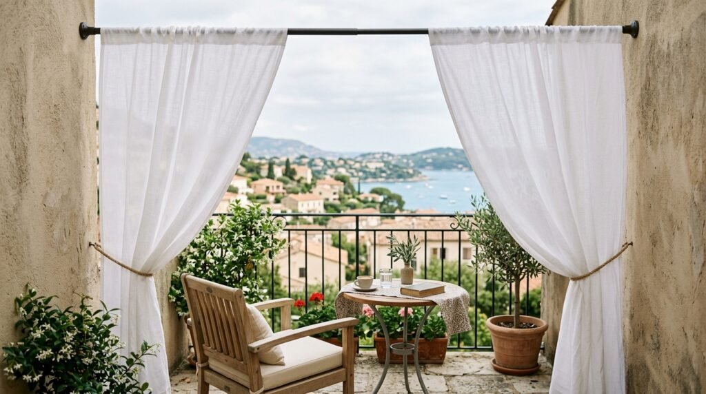 What it is: Curtain panels made from outdoor-rated fabric (polyester or Sunbrella) hung from a tension rod, ceiling rod, or curtain wire to create soft walls around the balcony.