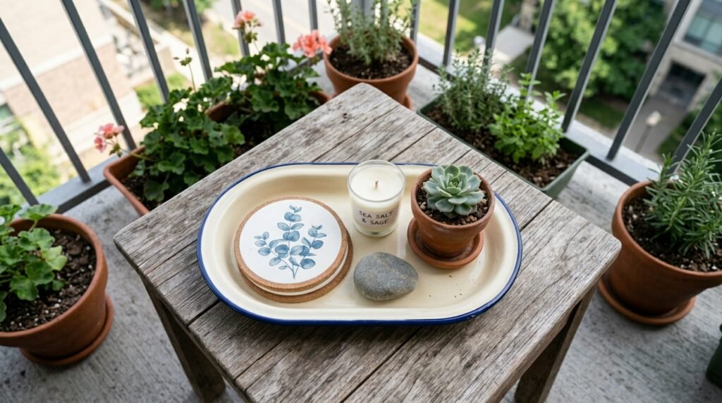 What it is: A weatherproof tray — ceramic, metal, or sealed wood — placed on your side table or railing shelf, styled with a few small objects: a candle, a small succulent, a coaster stack, a decorative stone.