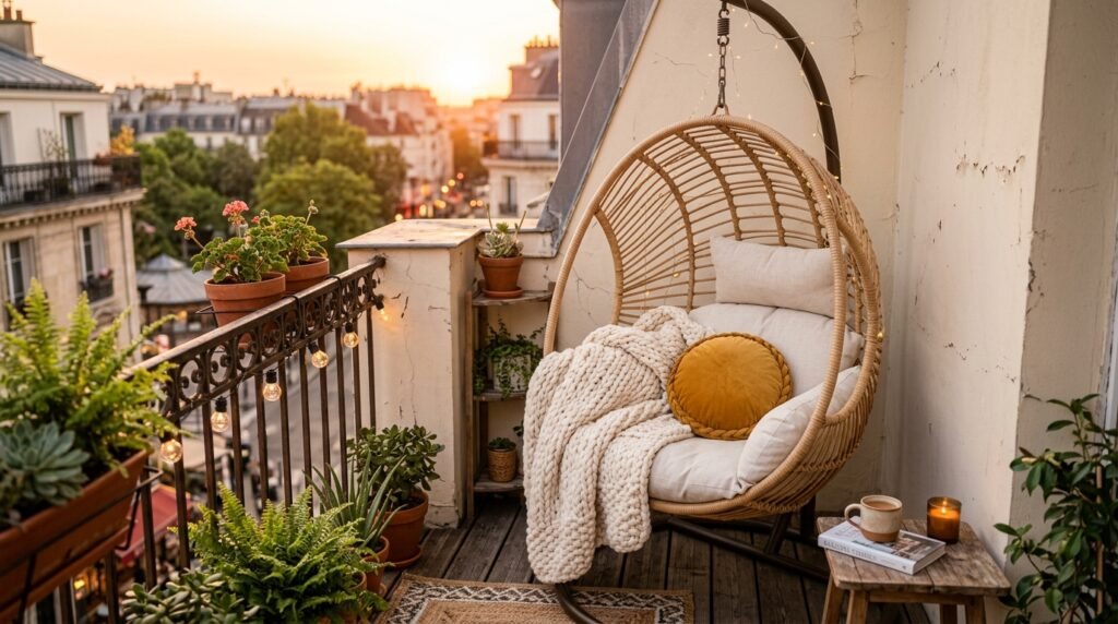 Why it works: A hanging chair does what no other single piece of furniture does — it makes a small balcony feel like an experience. It’s a destination in itself. It also floats above the floor, which makes the space feel less crowded than a sofa or armchair would.