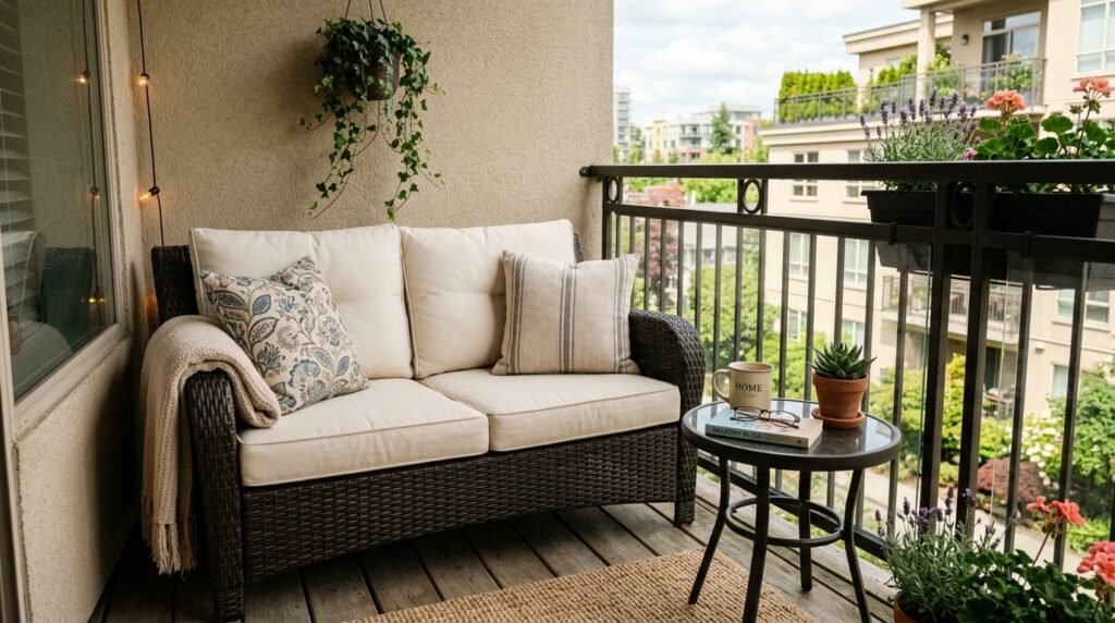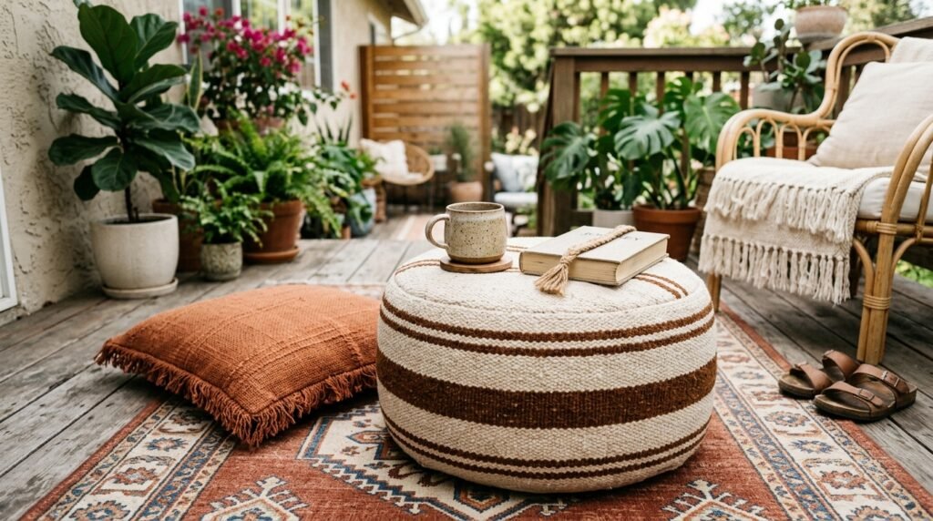 Why it works: Floor cushions or a pouf can be picked up and moved anywhere in seconds. They serve as extra seating when a guest arrives, a footrest when you’re alone, and a surface for a tray or a candle when no one is sitting. On a small balcony, that kind of flexibility is worth a lot.