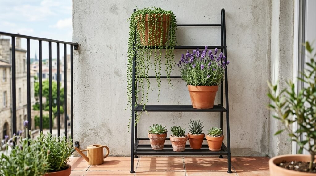 How to get it: Look for outdoor-safe metal or treated wood ladders with at least three tiers. Space the plants so the lower ones don’t get completely blocked from light by the upper ones. Front-to-back staging — shorter plants in front, taller in back — solves this naturally.