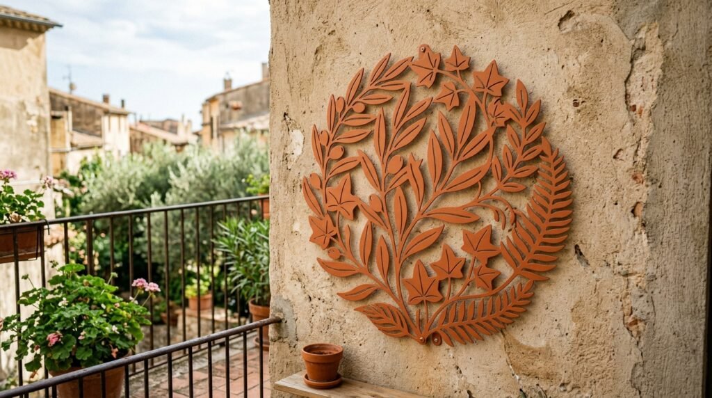 Best options: Wayfair and Etsy have excellent selections of outdoor metal wall art. Terracotta-colored metalwork looks particularly good against white or cream walls.