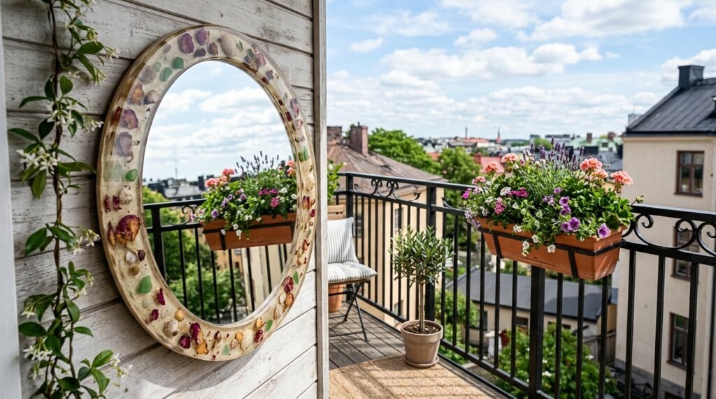 Why it works: A mirror on a balcony does something visually remarkable: it doubles the apparent size of the space. When positioned to reflect the greenery, the sky, or the seating area, it makes a 50 sq ft balcony feel like 100 sq ft. It also reflects light into corners that might otherwise feel dim.