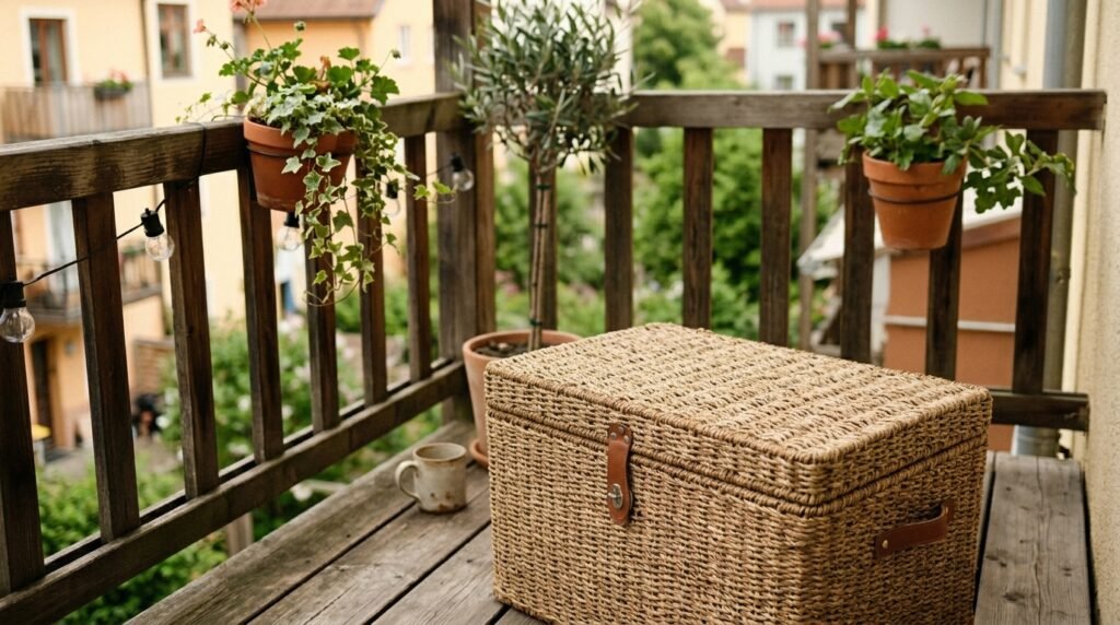 Pro tip: Swap the tray objects seasonally — citronella candle and a sunscreen bottle in summer; pinecones and a small lantern in autumn. It takes two minutes and makes the balcony feel freshly decorated.