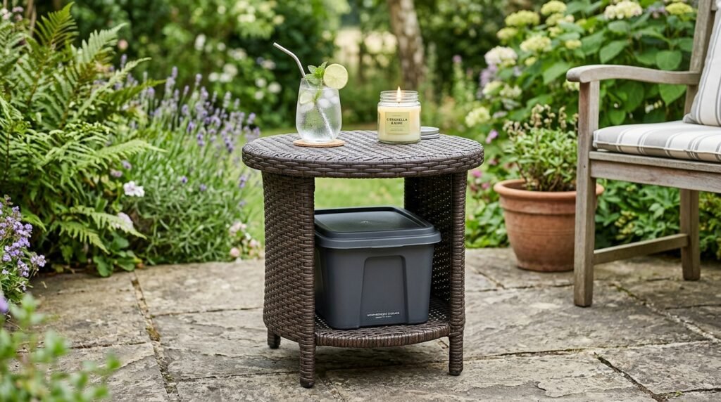 What it is: A small outdoor table — often round, 12–18 inches in diameter — that either has a built-in shelf below, a hollow interior for storage, or a lift-top that reveals a hidden compartment.