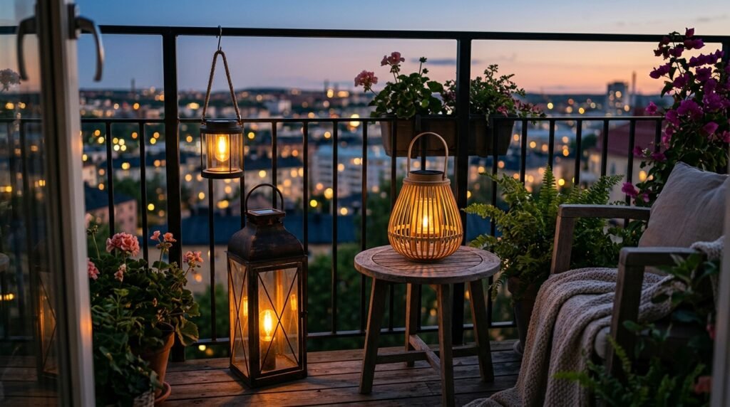 Why it works: Solar lanterns solve the no-outlet problem completely. They add ambient light in multiple spots without any cord management, and they turn on automatically at dusk so your balcony looks beautiful even when you forget.