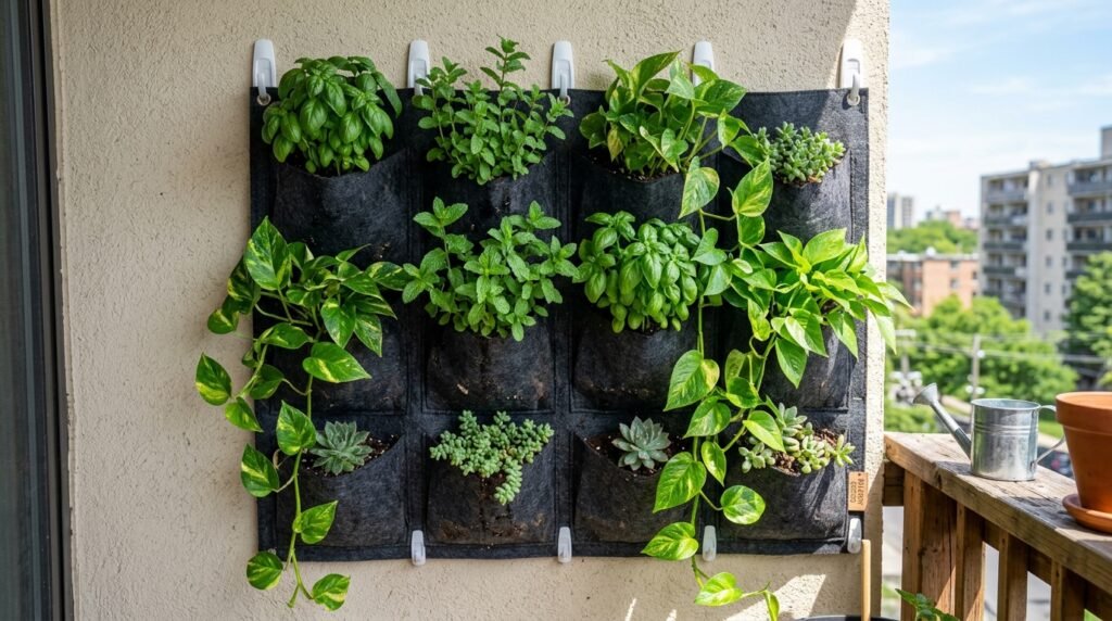 What it is: A modular panel system mounted on a wall or hung from the railing that holds multiple small planters vertically — turning a blank wall into a living green installation.
