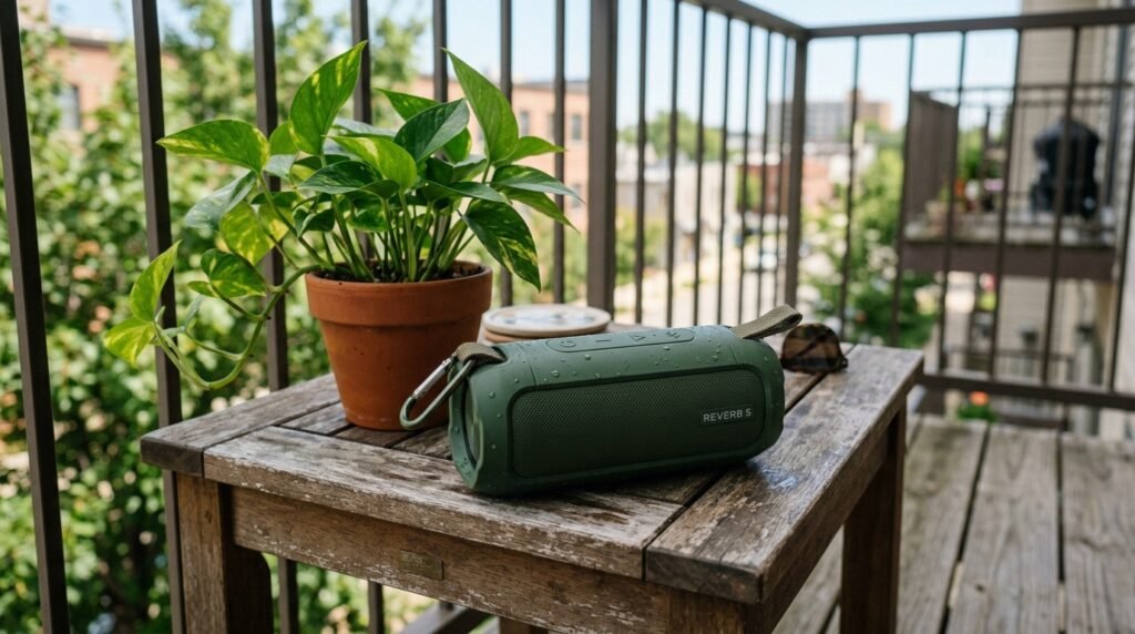 What it is: A compact, weatherproof (IPX5 or higher rated) Bluetooth speaker kept on the balcony for outdoor use.