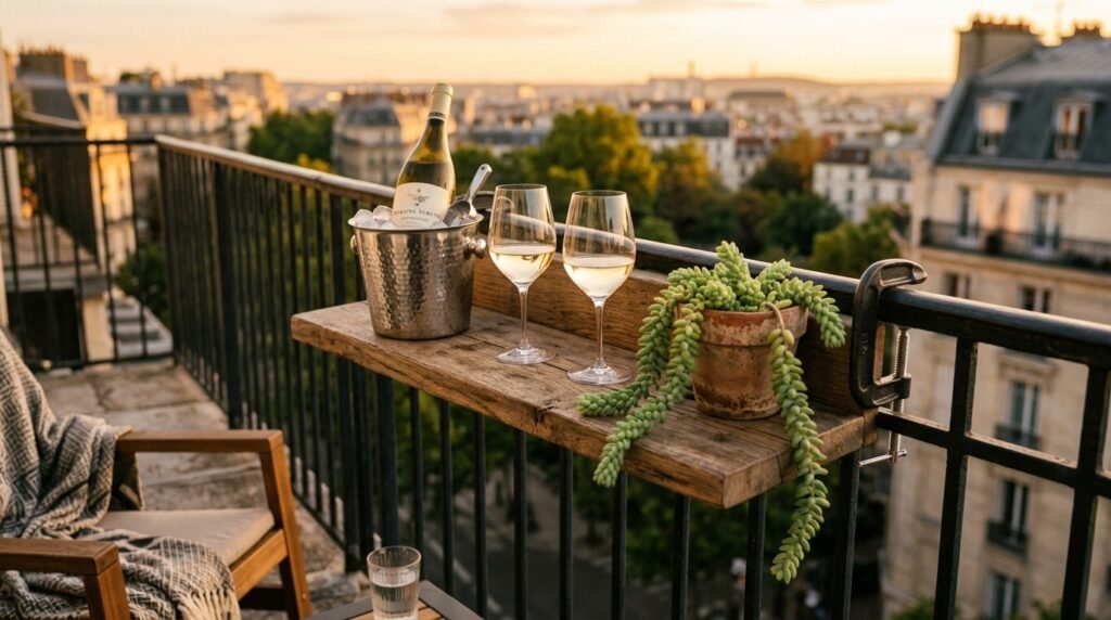 Pro tip: Use it as a bar setup for guests — a railing shelf with a small ice bucket, a few glasses, and a bottle of something makes a four-foot balcony feel like a proper outdoor entertaining space.