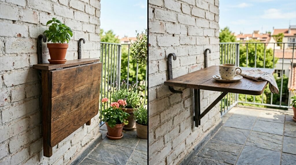 Why it works: A wall-mounted folding table is the ultimate space-saving move for a very small balcony. It gives you a surface for dining, working, or setting a drink without occupying any floor space when folded. It’s also one of the most useful things you can add if you want to use the balcony as a workspace.