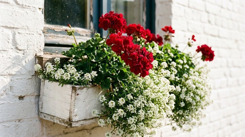 How to do it: Plant 3–5 upright geraniums (Pelargonium × hortorum) in the centre and rear of the box, then tuck sweet alyssum (Lobularia maritima) along the front edge. Space geraniums about 6 inches apart. Water when the top inch of soil feels dry.