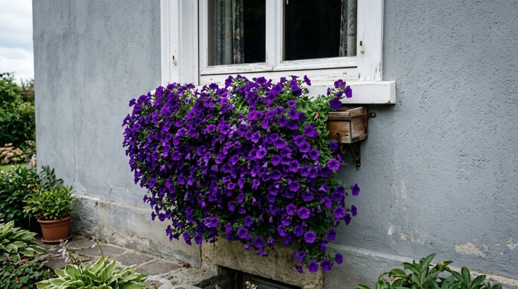 What it is: A window box planted exclusively with trailing Wave or Supertunia petunias in one bold colour — hot pink, deep purple, coral, or white — allowed to cascade freely down the front of the box.