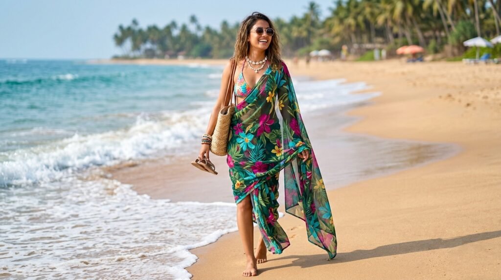 The resort saree is a relatively new concept but it has taken off brilliantly. A lightweight printed saree in sheer chiffon or fine cotton georgette draped loosely over swimwear — or styled with a simple camisole blouse — creates a look that is unmistakably Indian and completely at home on a beach, poolside, or at a sunset cocktail party in a tropical location.