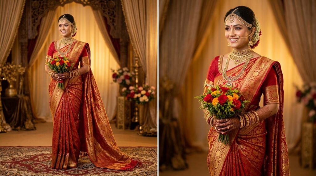 The bridal saree is not simply a saree — it is the most significant garment most Indian women will ever wear, carrying the weight of family tradition, cultural identity, and personal meaning. The classic bridal saree is a heavy Kanjivaram or Banarasi silk in deep red or bridal pink with intricate zari weaving, worn with the full suite of traditional bridal jewellery.