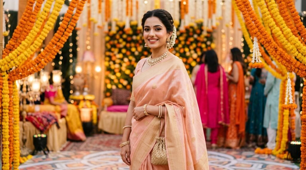 Being a wedding guest in India is its own art form, and the saree is often the garment of choice. The wedding guest saree navigates a careful balance — beautiful and celebratory enough to honour the occasion, restrained enough not to compete with the bride. Pastel tissue silks, soft organzas, and lightweight Chanderi sarees in peach, lilac, powder blue, and mint are the classic wedding guest palette.