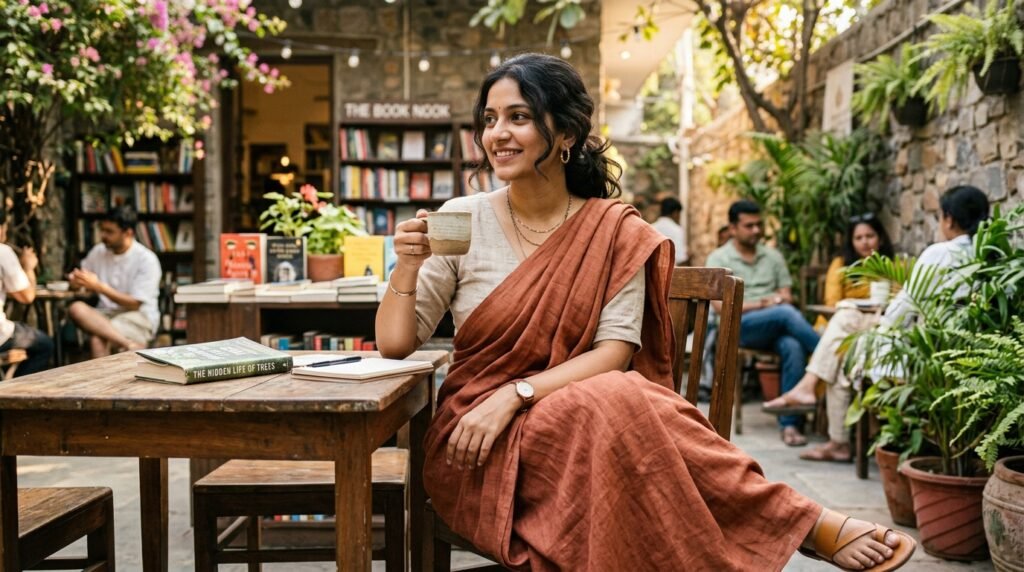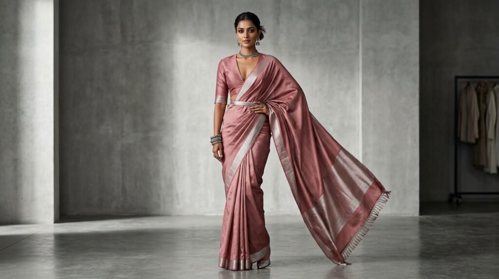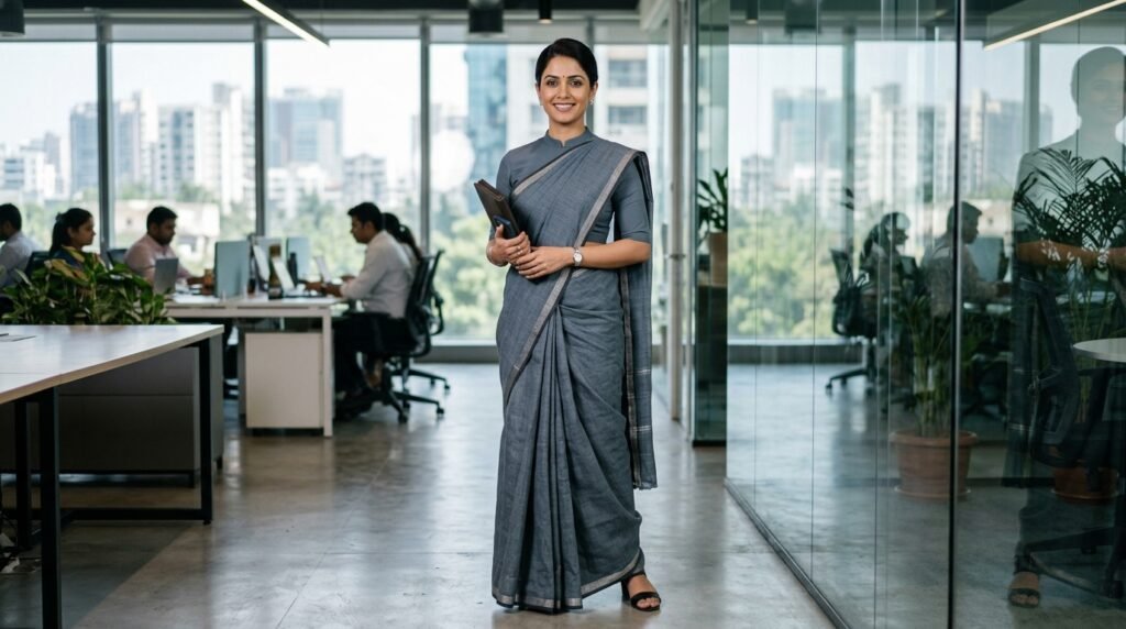 The office saree has undergone a complete transformation. Where it once meant a heavy silk and full jewellery — overdressed by any professional standard — today’s office saree is sleek, precise, and quietly powerful. Structured linen-blend or cotton sarees in slate grey, navy, olive, and camel with minimal borders read as sophisticated professional wear without any cultural compromise.