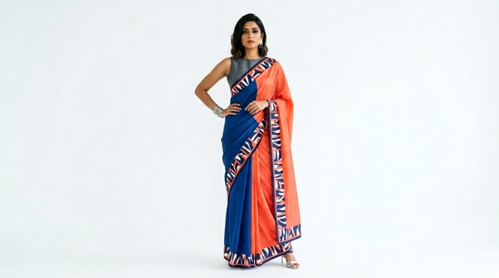 The colour-block saree is a modern Indian fashion designer’s experiment made wearable — two or more panels of contrasting colour joined at the border, creating a graphic, bold visual statement that reads more like contemporary art than traditional textile. Cobalt blue and bright coral. Emerald green and sunshine yellow. Deep purple and warm orange. The contrast is the point.