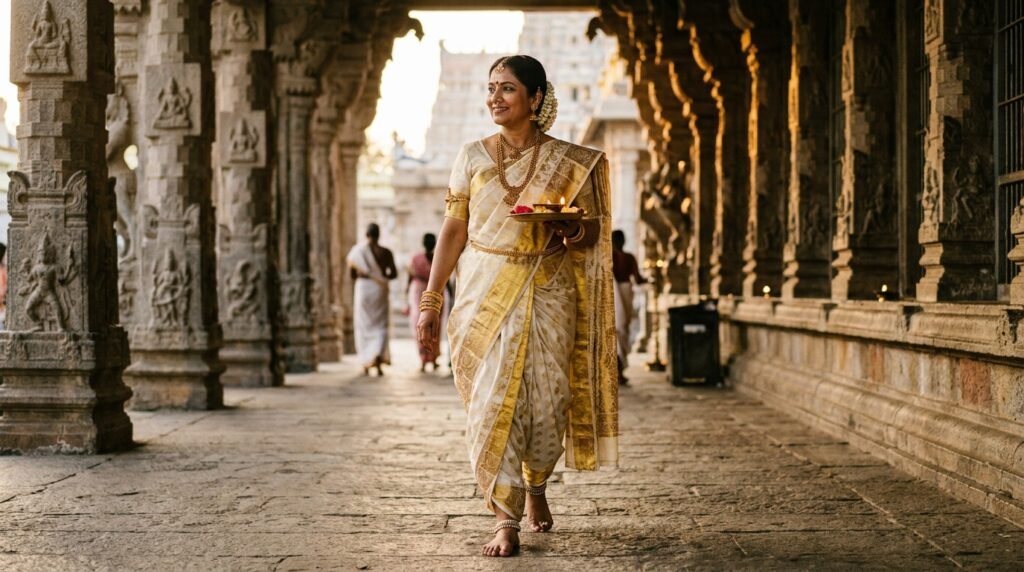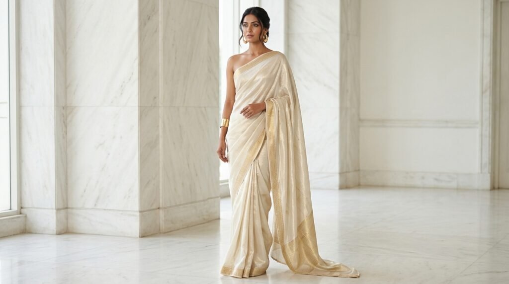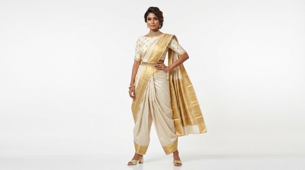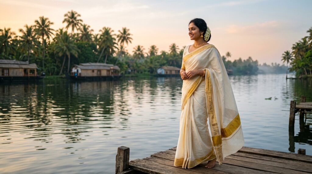 The Kerala Kasavu saree is instantly identifiable — cream white handwoven cotton or silk with a golden zari border, draped in the traditional Kerala style with the pallu left to fall naturally at the front rather than pinned at the shoulder. It is one of the most restrained and quietly beautiful saree styles in existence.
