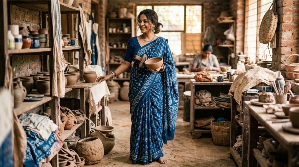 India’s handloom weaving tradition is one of the great cultural treasures of the world — and wearing handloom cotton sarees is one of the most direct ways to connect with and support that tradition. Indigo block-print cotton from Rajasthan, ikat cotton from Andhra Pradesh, Jamdani cotton from Bengal — each represents a distinct regional tradition of extraordinary skill.