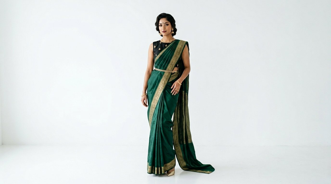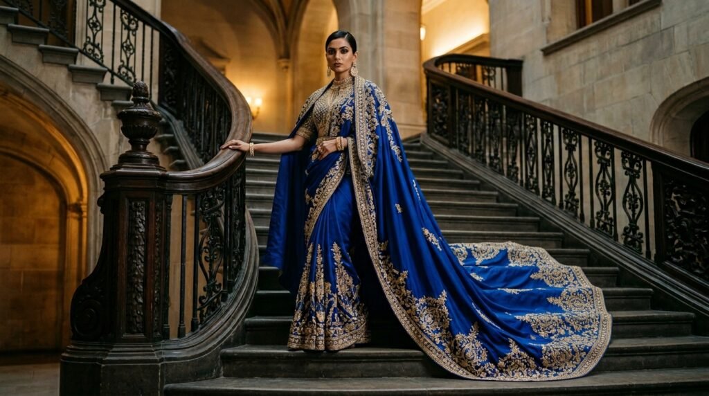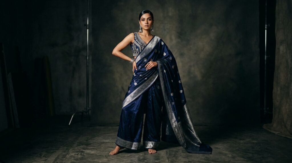 Midnight navy with silver zari, deep forest green with gold — colours that have weight and richness suit this style perfectly. Pair with a sleek embroidered or structured blouse and minimal footwear. This is one of the most versatile draping styles in this list because it works for festive occasions, fashion events, and even formal dinners.