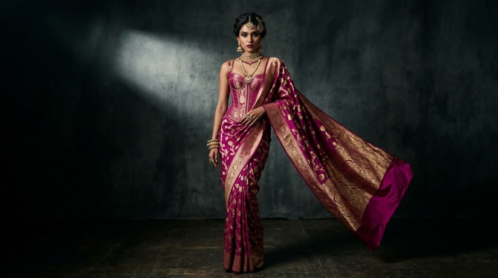 The corset blouse revolution in Indian fashion has been one of the most exciting developments of the last decade. A boned, structured corset blouse — whether laced at the back or with hook-and-eye closures — paired with a rich Banarasi or embroidered silk saree creates a silhouette that is simultaneously bridal, fashion-forward, and deeply dramatic.