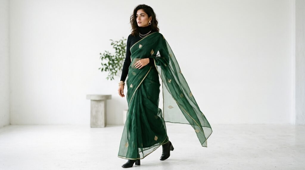 Forest green organza over a black turtleneck, or pale blush chiffon over a cream roll-neck — the layering creates a depth of texture that looks considered and intentional. This works particularly well in winter months when a regular saree blouse would feel too exposed, and it photographs incredibly well because of the contrast between the clean neckline and the draped fabric.