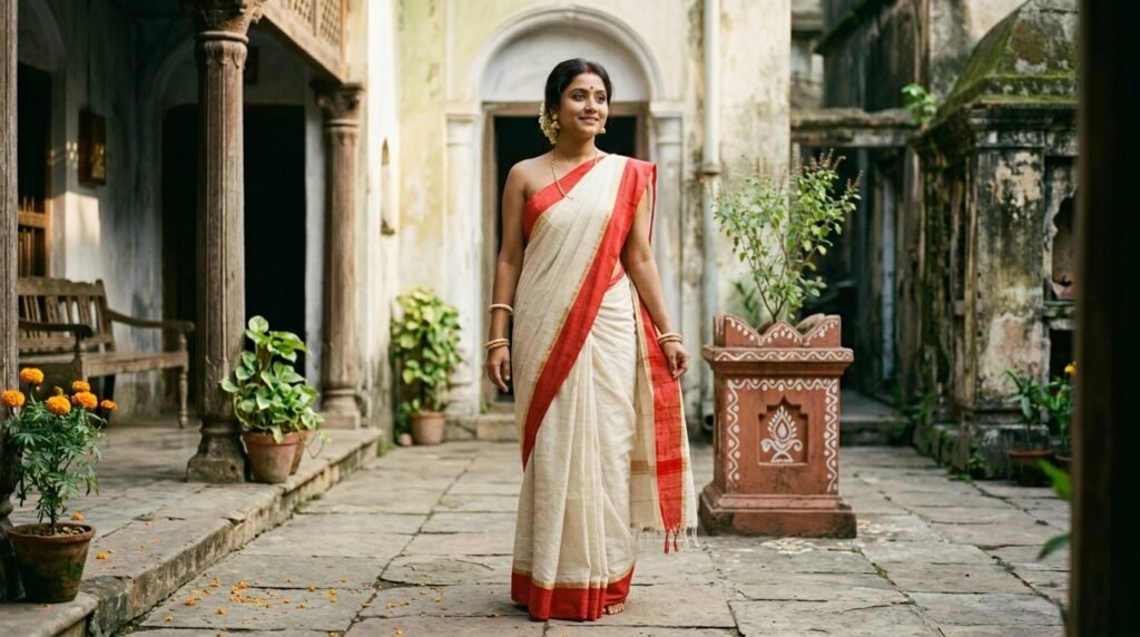 A white cotton saree with a bold red border is the classic Bengali look, and it remains one of the most elegant and culturally resonant saree styles in existence. Worn during Durga Puja and other Bengali celebrations, this drape connects the wearer to centuries of cultural history while remaining completely timeless in its beauty.