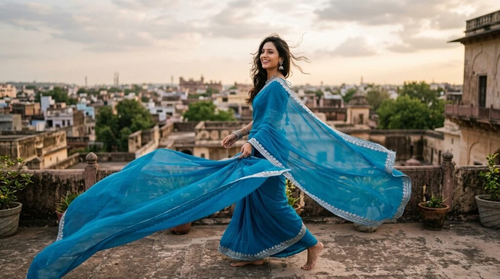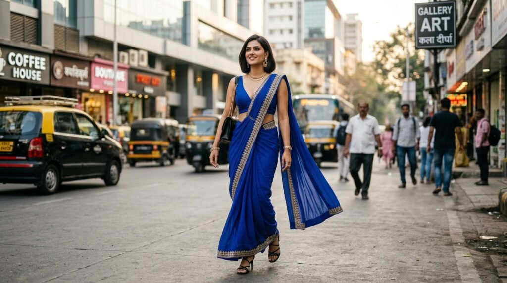 Styling tip: Choose fabrics that can be hand-washed and that dry quickly. Resort dressing requires practicality — you want to actually wear the saree, not worry about it.