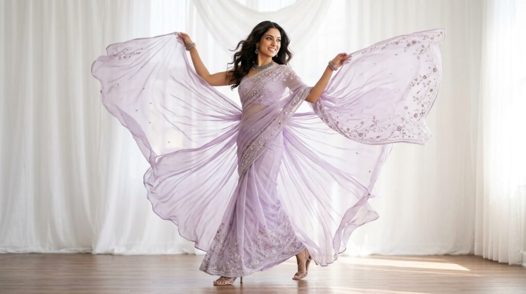 Styling tip: Chiffon can be slippery. Use saree pins at key points — waist and shoulder — and consider a small amount of double-sided tape at the pleats for security.