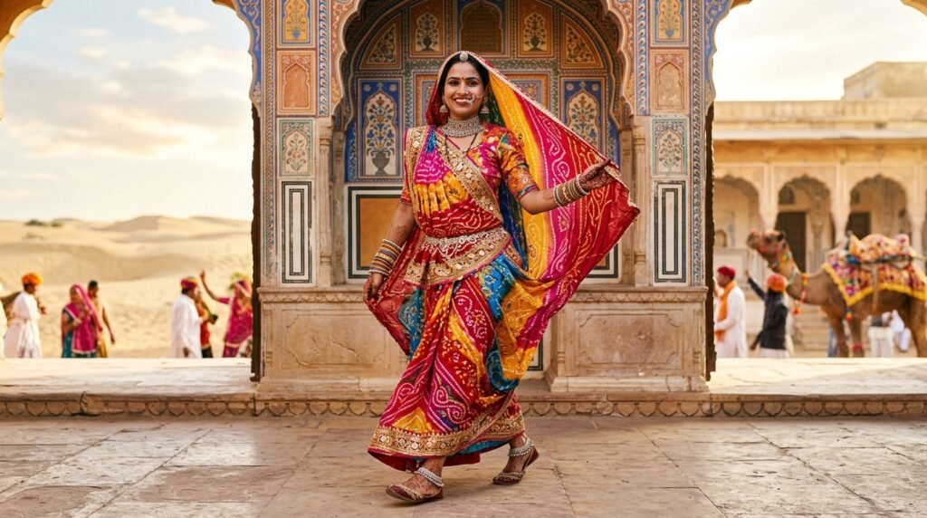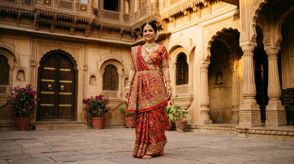 Rajasthani saree draping style is distinguished by its vibrant colour palette and the addition of the odhni — a printed or embroidered head covering that is draped over the head and one shoulder as part of the complete look. Bandhani (tie-dye) sarees in reds, pinks, and yellows are the traditional choice, creating a look of joyful, unapologetic colour.