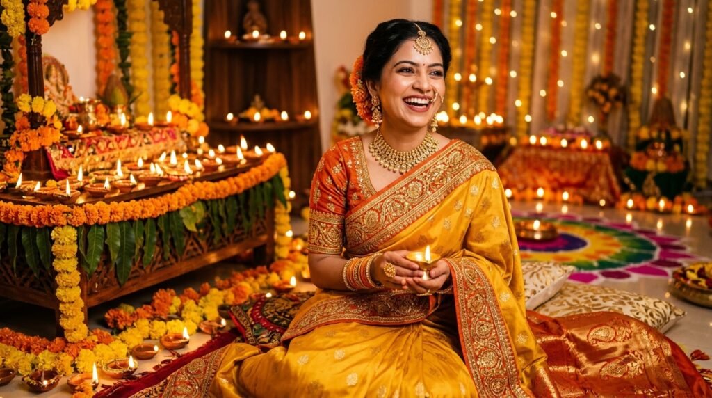 Styling tip: Photograph your Diwali saree in the glow of diya lights rather than overhead lighting — the warm flickering light does extraordinary things to silk and gold embroidery.