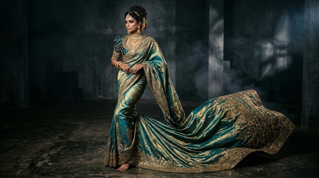 The mermaid saree drape is conceptual fashion at its most dramatic — the fabric is wrapped tightly around the hips and thighs, then allowed to flare into a wide dramatic train at the hem, creating the unmistakable silhouette of a mermaid’s tail. This is not a practical drape. It is a photographic drape, a fashion show drape, a statement about what a saree can be when you push its limits.