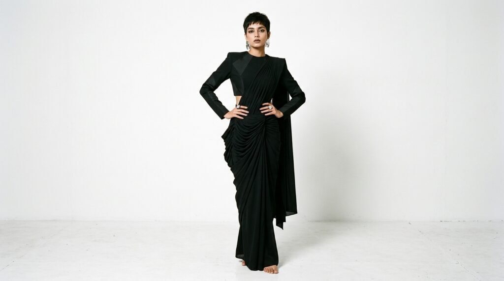 Shimmering ivory, champagne gold, and pale silver fabrics make the most of this style because they reference the marble sculptures and classical imagery that inspire the drape’s aesthetic. Pair with architectural jewellery — a cuff, a geometric earring — rather than traditional Indian pieces, and the look is genuinely stunning.