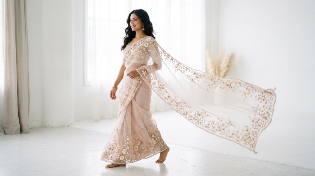 Organza has transformed the saree landscape over the last decade. Its sheer, structured quality is unlike any other saree fabric — it holds shape where chiffon would collapse, but remains translucent where silk would be opaque. The result is a fabric that creates architectural drapery while still feeling light and ethereal.
