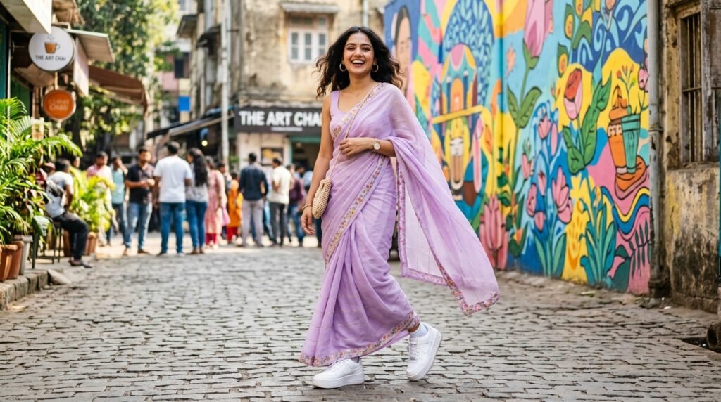 Nothing signals the complete democratisation of saree fashion quite like styling it with sneakers — and the look has gone from controversial to mainstream in just a few years. A pastel chiffon or printed cotton saree with clean white chunky sneakers or neutral canvas shoes is now a legitimate fashion choice embraced by influencers, celebrities, and everyday wearers alike.