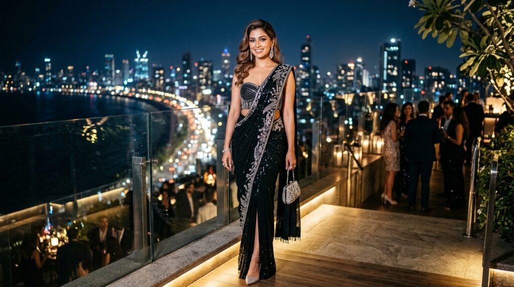 The cocktail saree is where Indian fashion meets international party dressing — and the results are spectacular. Sequined, embellished, and heavily embroidered sarees in dramatic colours — midnight black with silver, deep navy with gold, forest green with copper — draped with a strapless structured blouse or a deeply backless choli, are among the most glamorous outfits it is possible to wear.