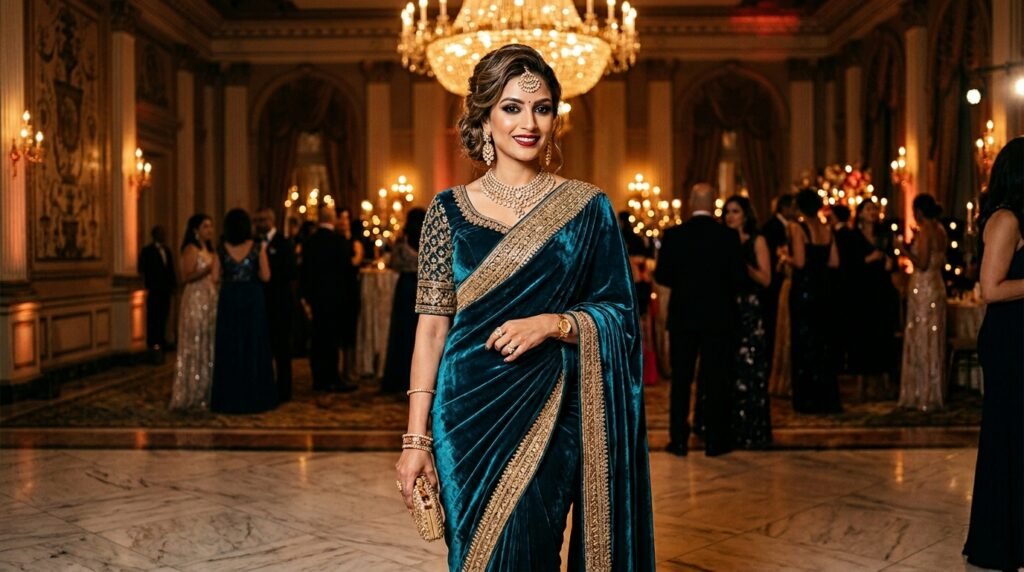 Velvet sarees occupy a unique space in Indian fashion — they are glamorous, rich, and completely distinctive. The way velvet catches and absorbs light creates a depth of colour that no other fabric achieves. Deep teal, midnight black, forest green, and ruby red are the velvet colours that look most extraordinary under evening lighting.