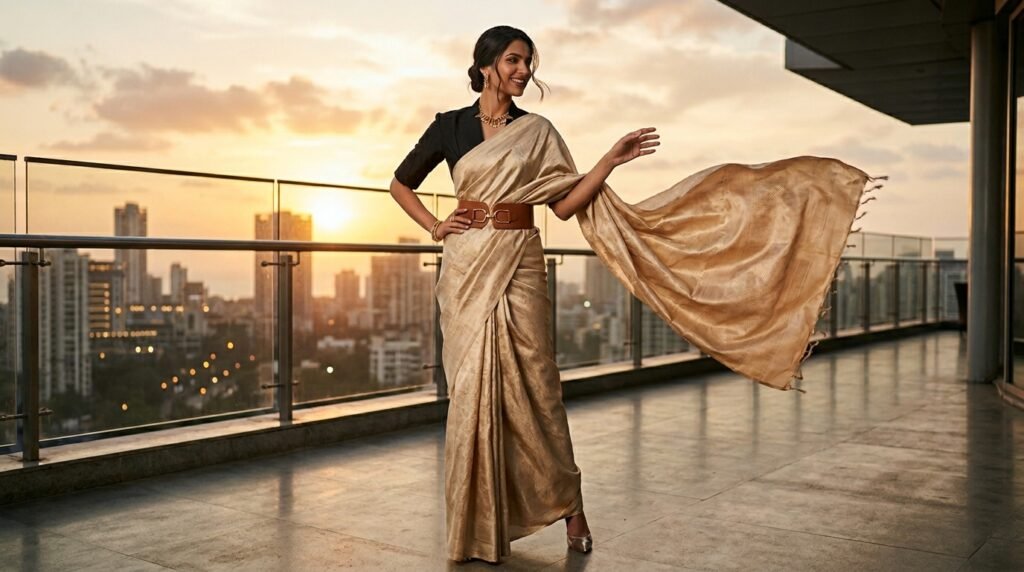 The belt changed everything. When stylists started cinching sarees with wide leather belts or statement metallic waistbands, the garment went from flowing and traditional to architectural and runway-ready. The belt creates a defined waist, gives the saree a more structured silhouette, and adds an unexpected fusion element that makes the look feel entirely modern.