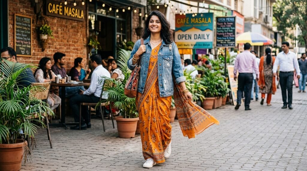 Young Indian women have completely reimagined the saree as casual wear — and the denim jacket drape is the best example of that shift. Take a vibrant printed cotton or Chanderi saree in warm saffron, deep orange, or electric blue, drape it casually, and add a cropped vintage denim jacket on top.