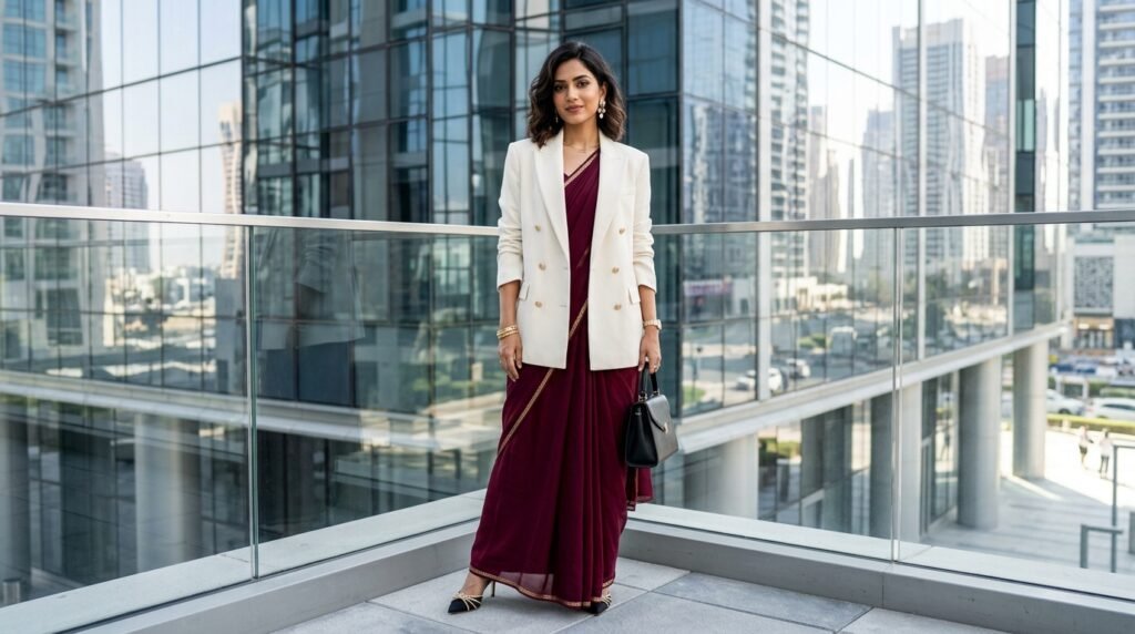 The saree-and-blazer combination is one of the most powerful outfits in modern Indian fashion. It bridges traditional and contemporary in one look — all the grace of a saree with all the authority of tailoring. Drape your saree in a classic Nivi style, then throw a crisp oversized blazer over the blouse.