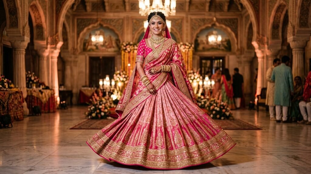 The result is a garment that has the cultural resonance of a saree and the youthful, festive energy of a lehenga. Heavily embroidered fabrics in bridal pinks and golds look spectacular in this style. It is particularly popular with younger women who love the saree but find the lehenga’s footwork freedom appealing.